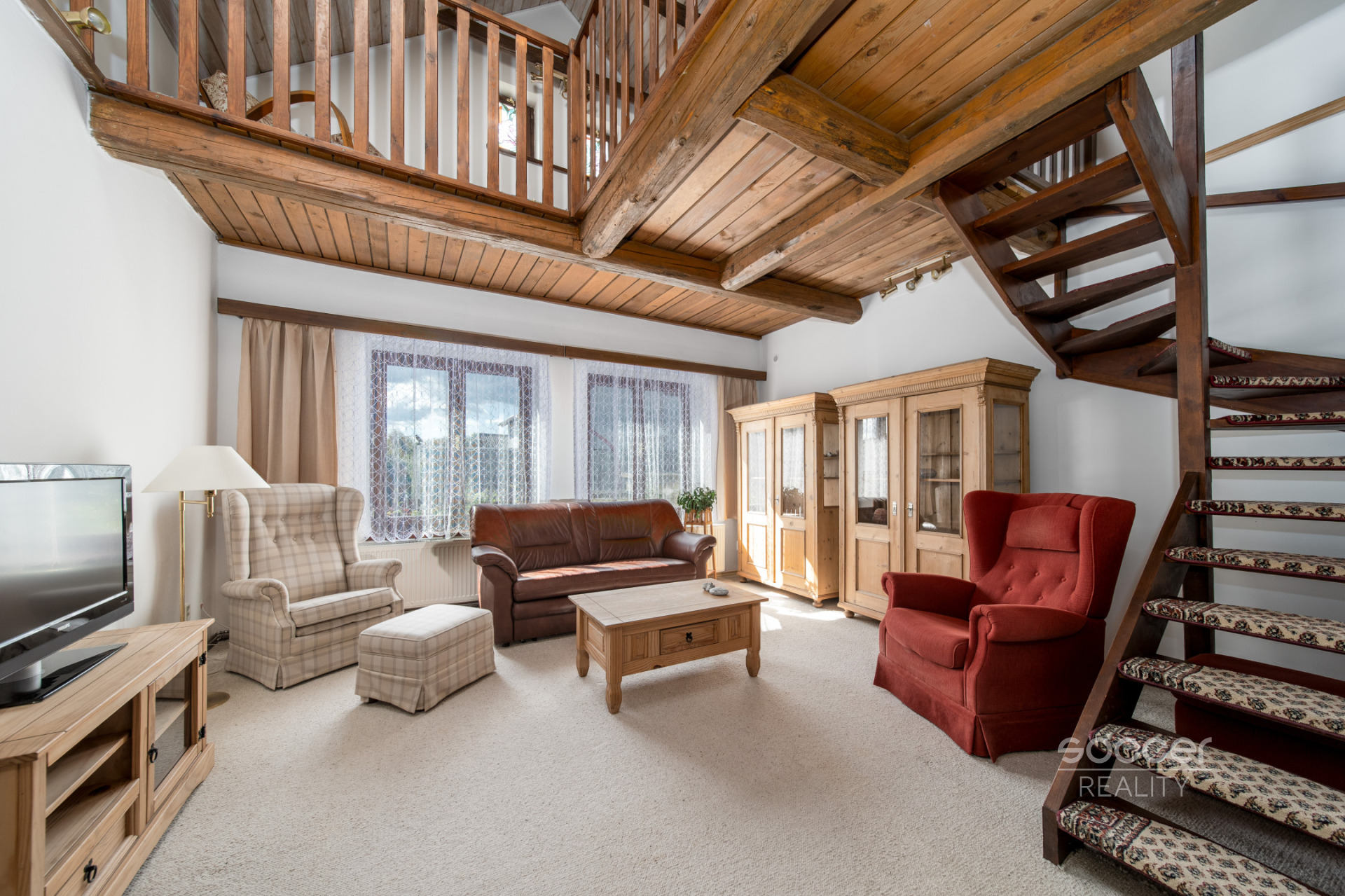Samotný nenápadný dům vás okouzlí mimořádně útulným zázemím. Je vybaven stylovým nábytkem, který ladí s duchem místa. Dispozičně je řešen jako 3+kk, plus velká obytná galerie. Najdete zde vstupní chodbu s masivním schodištěm a dvě koupelny (jednu v přízemí a druhou v podkroví). Na obytnou galerii vede schodiště také přímo z hlavního obytného pokoje. Ten je plynule propojen s kuchyňským a jídelním koutem. Interiér mile překvapí atypickým řešením a jedinečnou atmosférou.