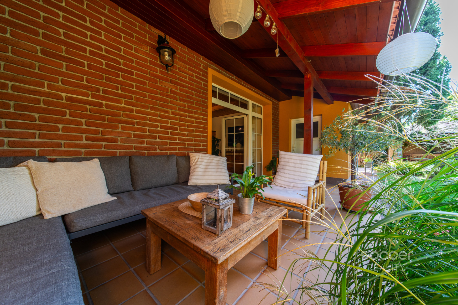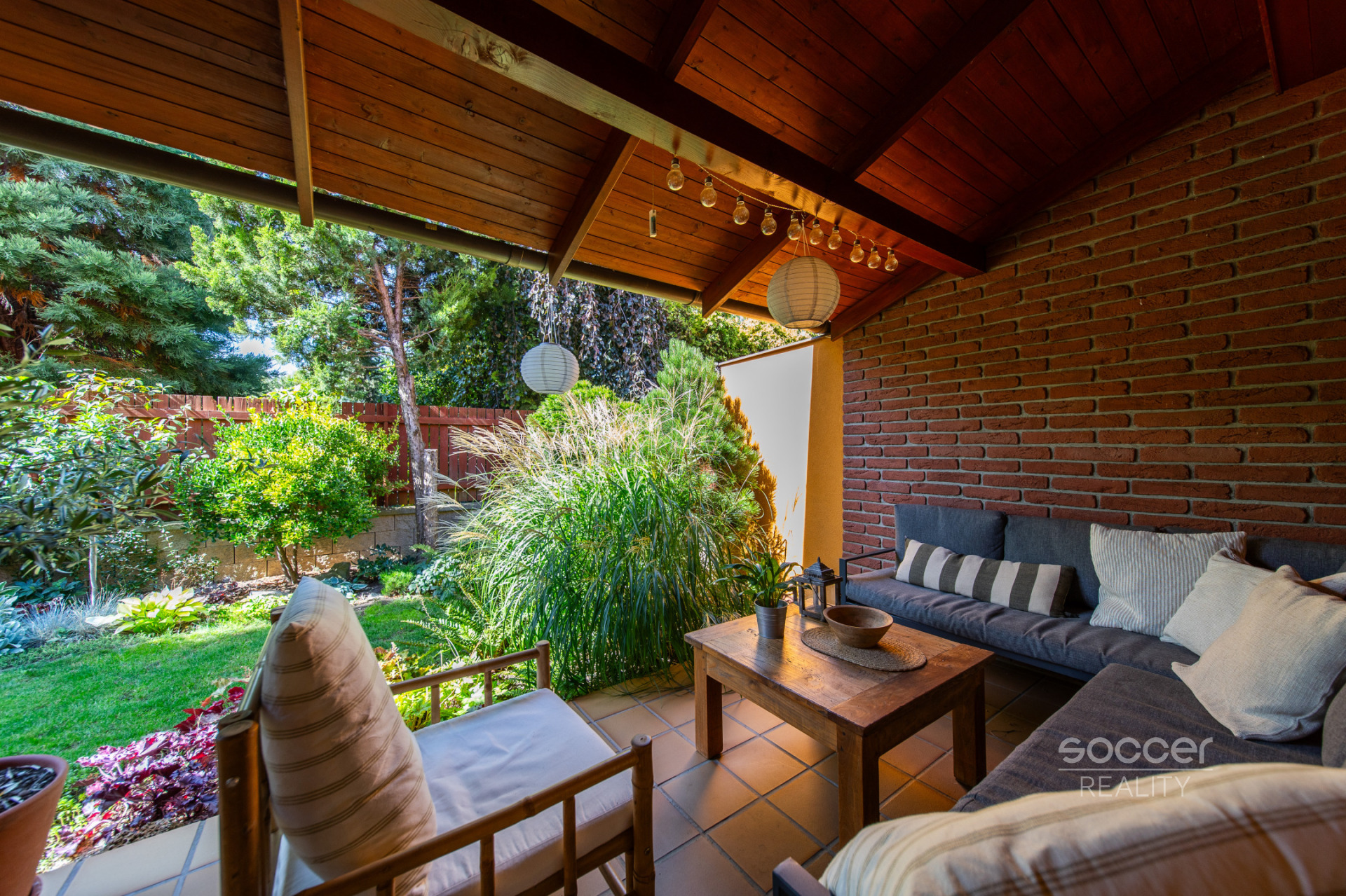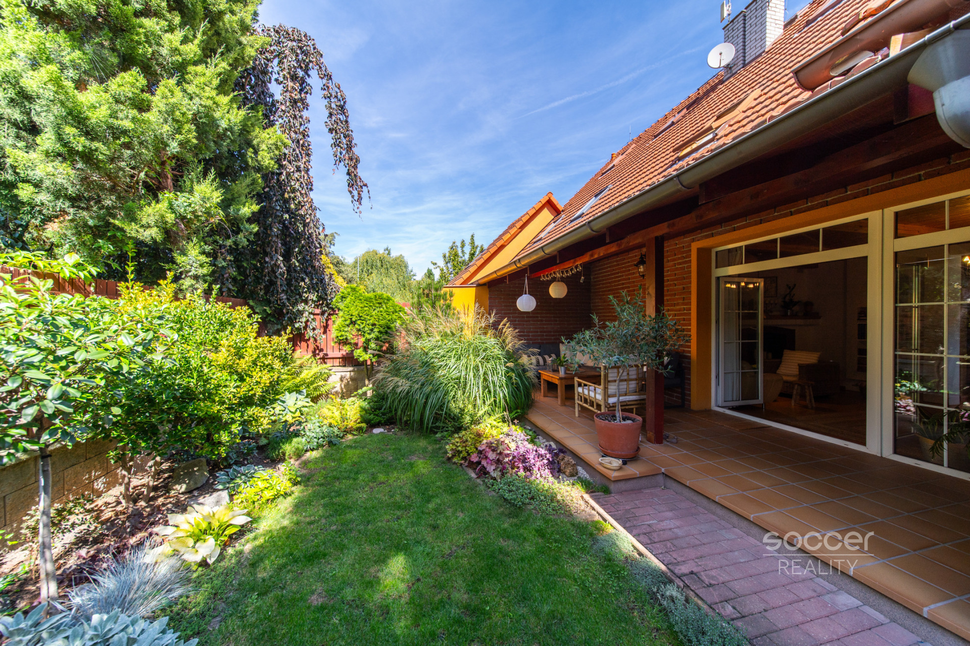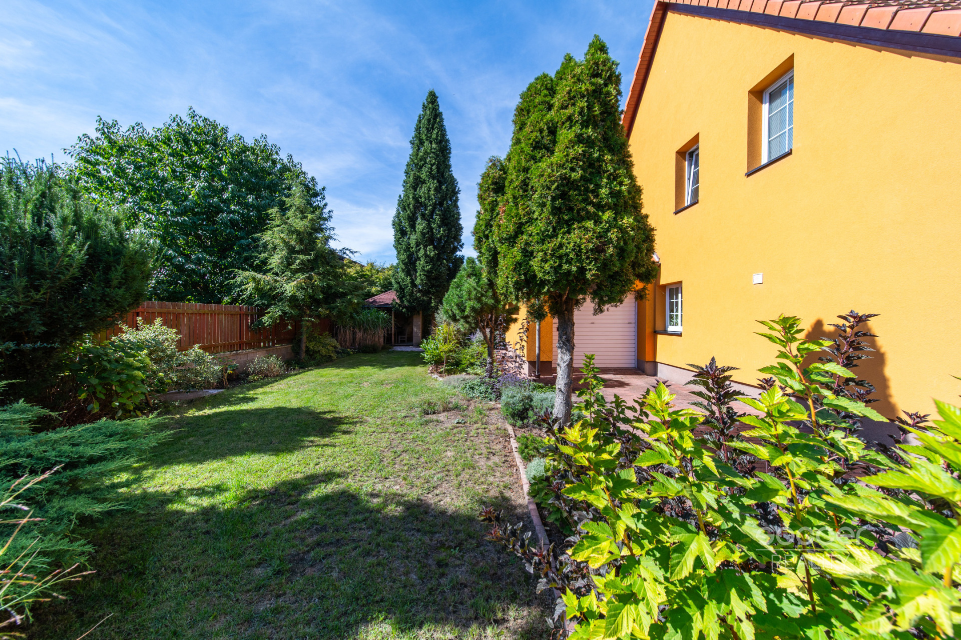 Pozemek kolem domu nabízí příjemnou zahradu se vzrostlými stromy a okrasnými keři, které v létě zajišťují dostatek stínu i soukromí. Na zahradě je zahradní domek a zastřešená pergola ideální k odpočinku či posezení s přáteli. Zpevněné plochy kolem domu jsou provedeny ze zámkové dlažby, parkovat lze v garáži i na pozemku.