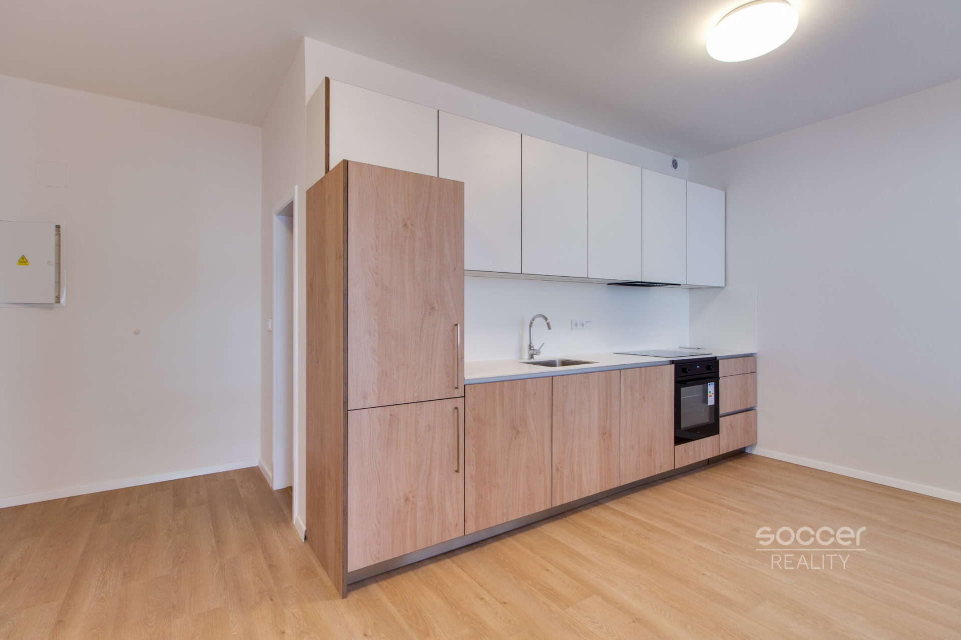 Po vstupu do bytu vejdete do prostorné předsíně, která je ihned spojená s kuchyňským koutem, kde se nachází kompletně vybavená kuchyňská linka se všemi spotřebiči včetně pračky a myčky. Koupelna je se sprchovým koutem a WC.