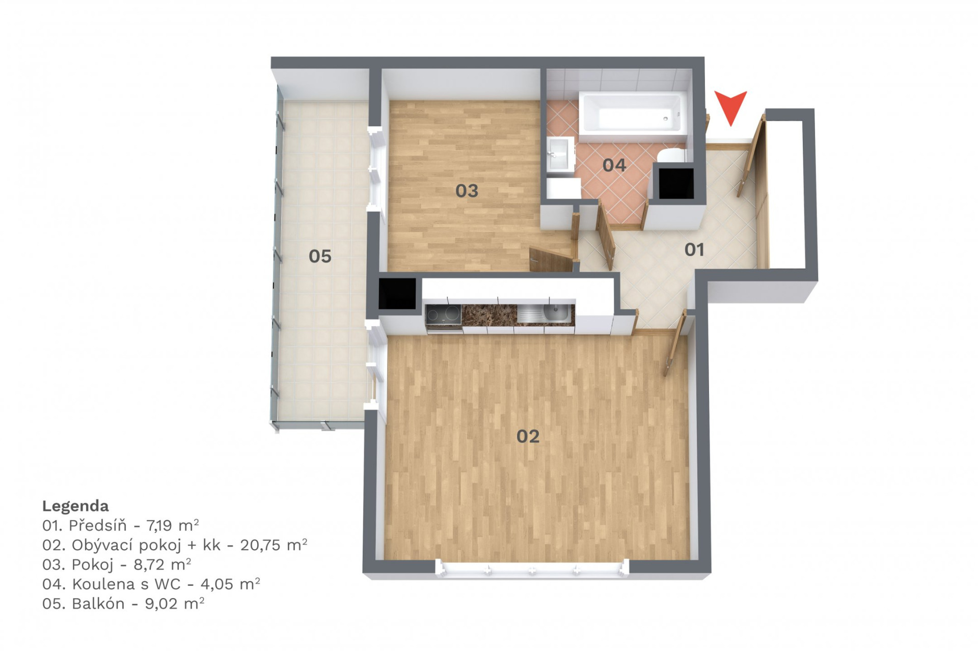 Po vstupu vás přivítá předsíň s vestavěnou skříní, která je dostatečně prostorná pro uložení všech potřebných věcí. Z předsíně se dostanete do všech ostatních místností. Obývací pokoj je vybaven kuchyňskou linkou (lednice, myčka, trouba, sklokeramická deska, digestoř). Balkon v tomto pokoji nabízí výhled do okolí severozápadním směrem. Ložnice se nabízí nevybavená. Koupelna je s vanou, toaletou a přípravou na pračku.