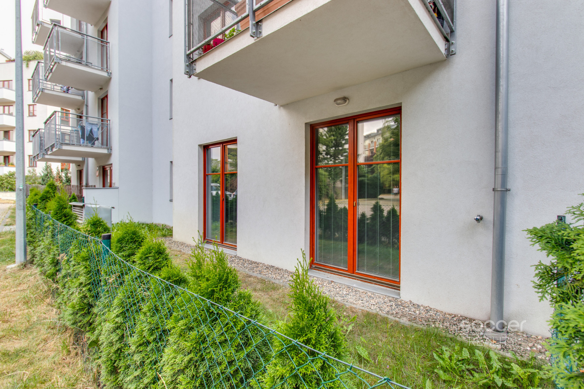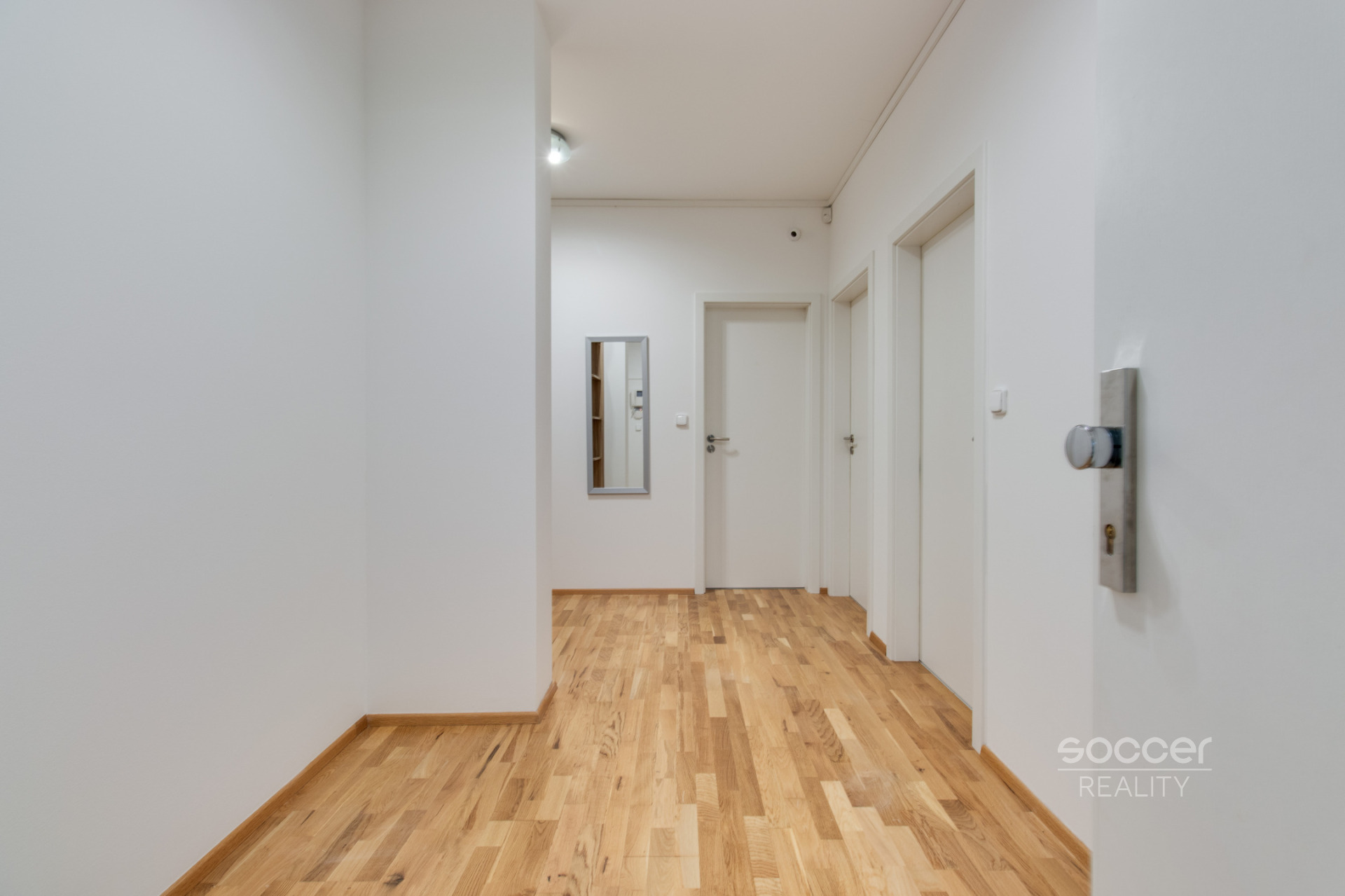 Po vstupu do bytu se ocitnete v předsíni vybavené vestavěnou skříní. Z předsíně (ve tvaru L) je vstup do dvou samostatných místností (14,6 m2 a 14,4 m2), jež obě nabízí vchod na předzahrádku. Dále vedou z předsíně dveře do obývacího prostoru (27,1 m2) spojeného s kuchyňským koutem. Dále se z této předsíně dostanete do koupelny, jež je vybavena jak velkým sprchovým koutem tak vanou, takže na své si přijdou milovníci obou těchto variant. WC je samostatné a sousedí s koupelnou.