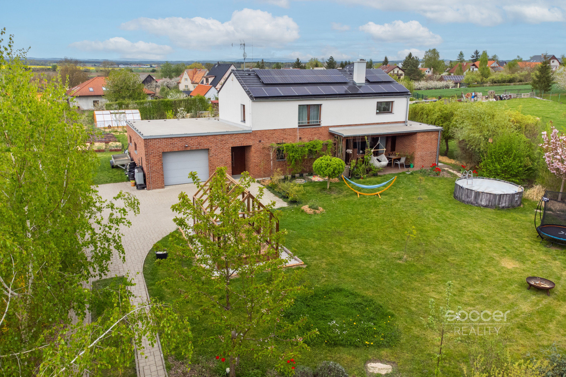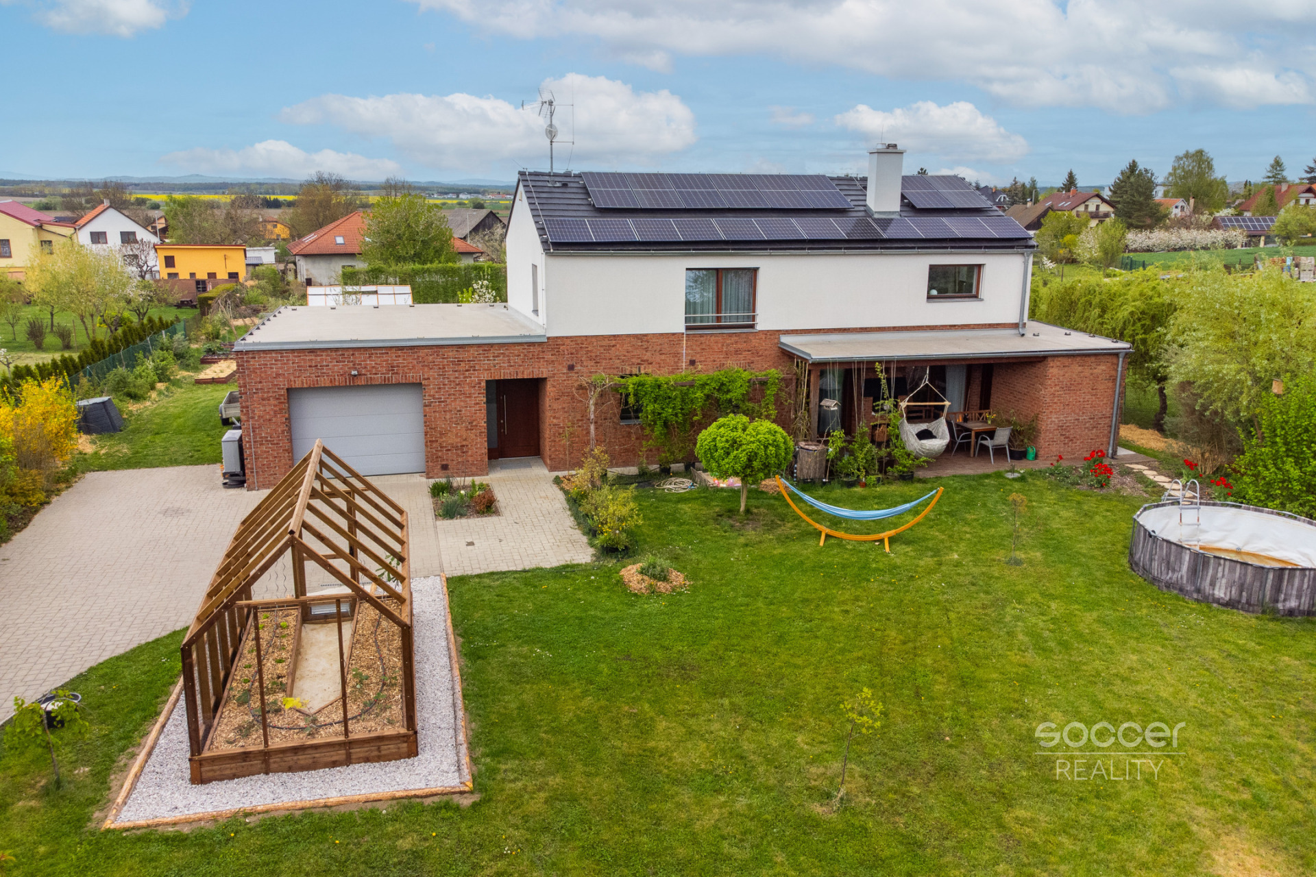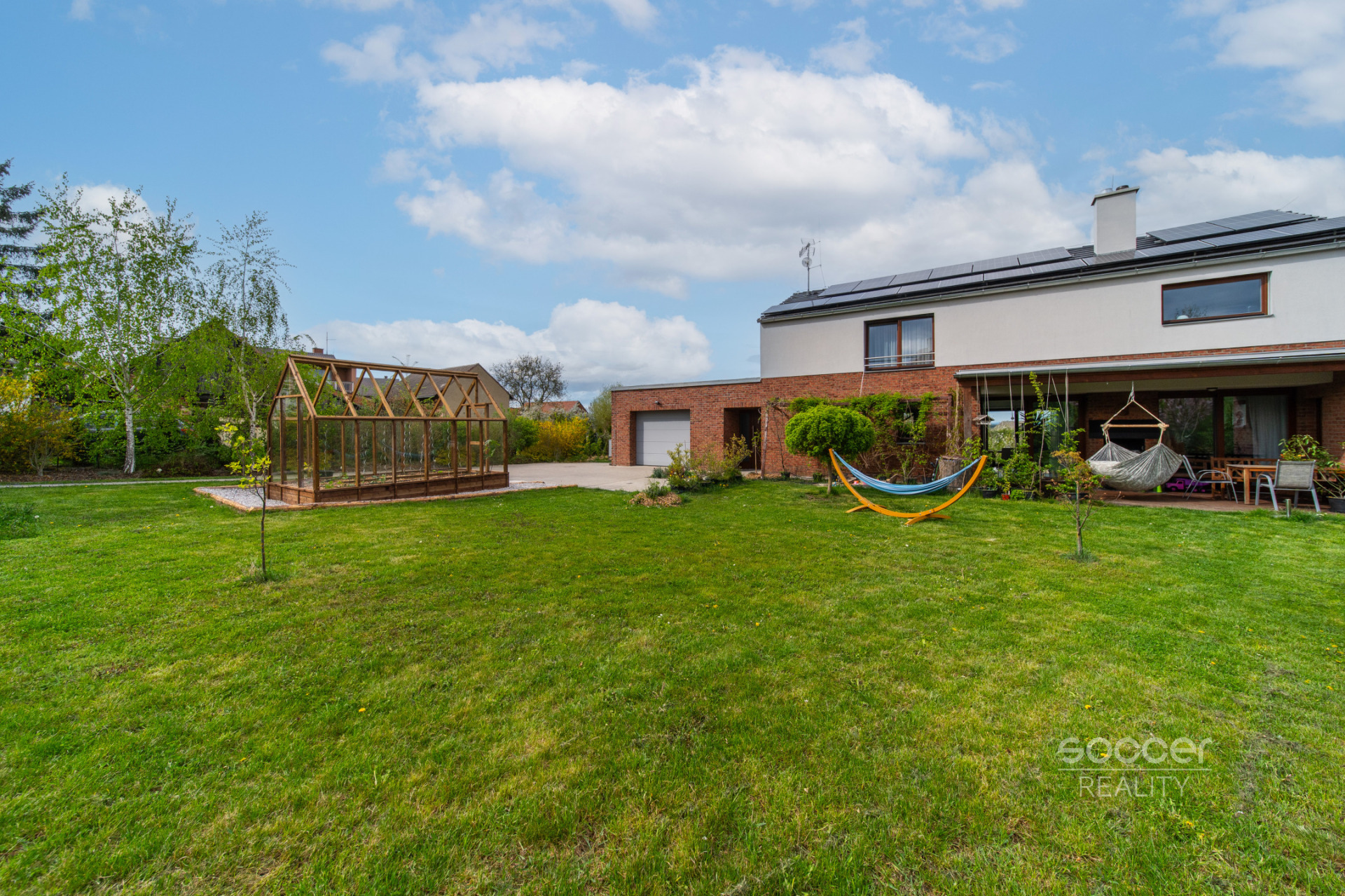 Velmi vkusný dům vám poskytne velkorysé zázemí ve dvou podlažích. Dispozičně je řešen jako 5 + kuchyňský kout + dvě koupelny + terasa + dvougaráž + dva sklady. Pro celý interiér jsou charakteristické vysoce kvalitní materiály. Nadchne vás také praktické technické zázemí jako tepelné čerpadlo, krb, solární panely, studna pro závlahu zahrady. Dům je napojen na veřejný vodovod i kanalizaci, byl dokončen a zkolaudován na konci roku 2017. Díky zateplení, pokročilým technologiím a efektivním způsobům vytápění dosahuje mimořádně příznivé režie cca 3000 Kč/měsíc a pyšní se energetickou třídou B - Velmi úsporná.
