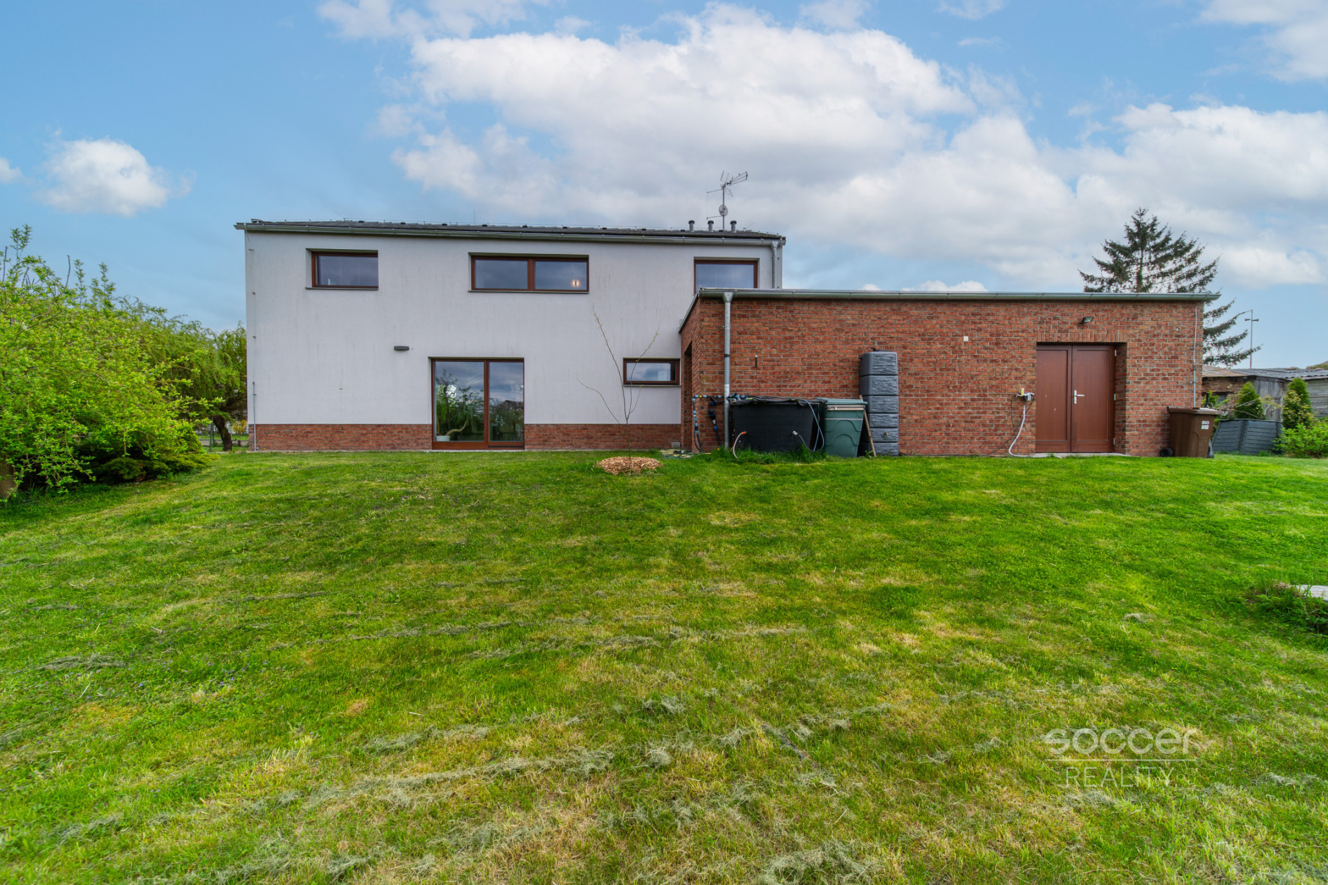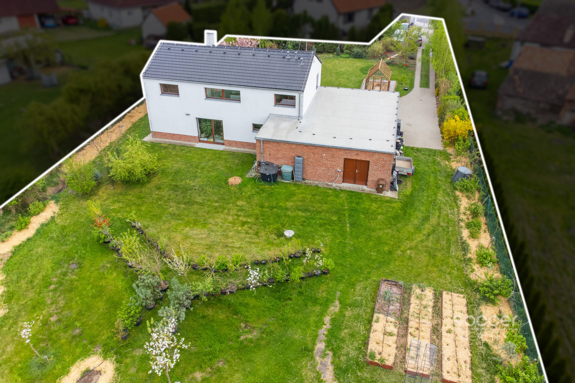 Nízkonákladový dům 5+kk, 2 koupelny, terasa, garáž pro 2 automobily + min. 4 parkovací stání, 2 sklady, pozemky celkem 2363 m2 (včetně plošné rezervy pro potenciálně další stavbu), městys Březno u Mladé Boleslavi.