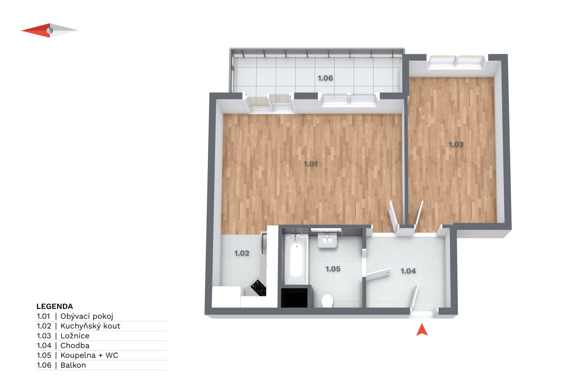 Dispozice je řešena velmi prakticky. Ze vstupní chodby je samostatný přístup do všech místností. Byt nabízí oddělenou ložnici, obývací pokoj a koupelnu s toaletou.