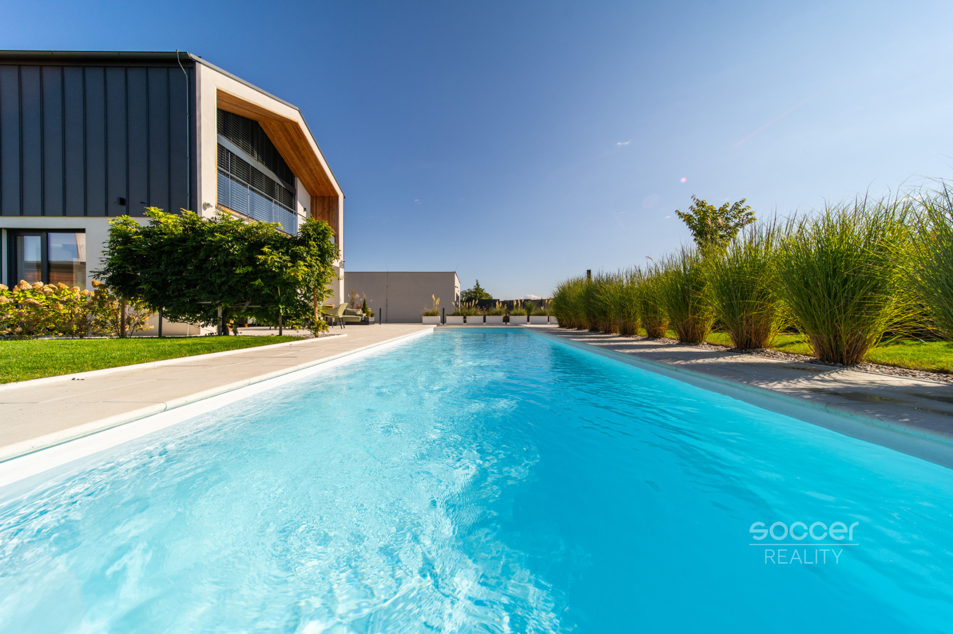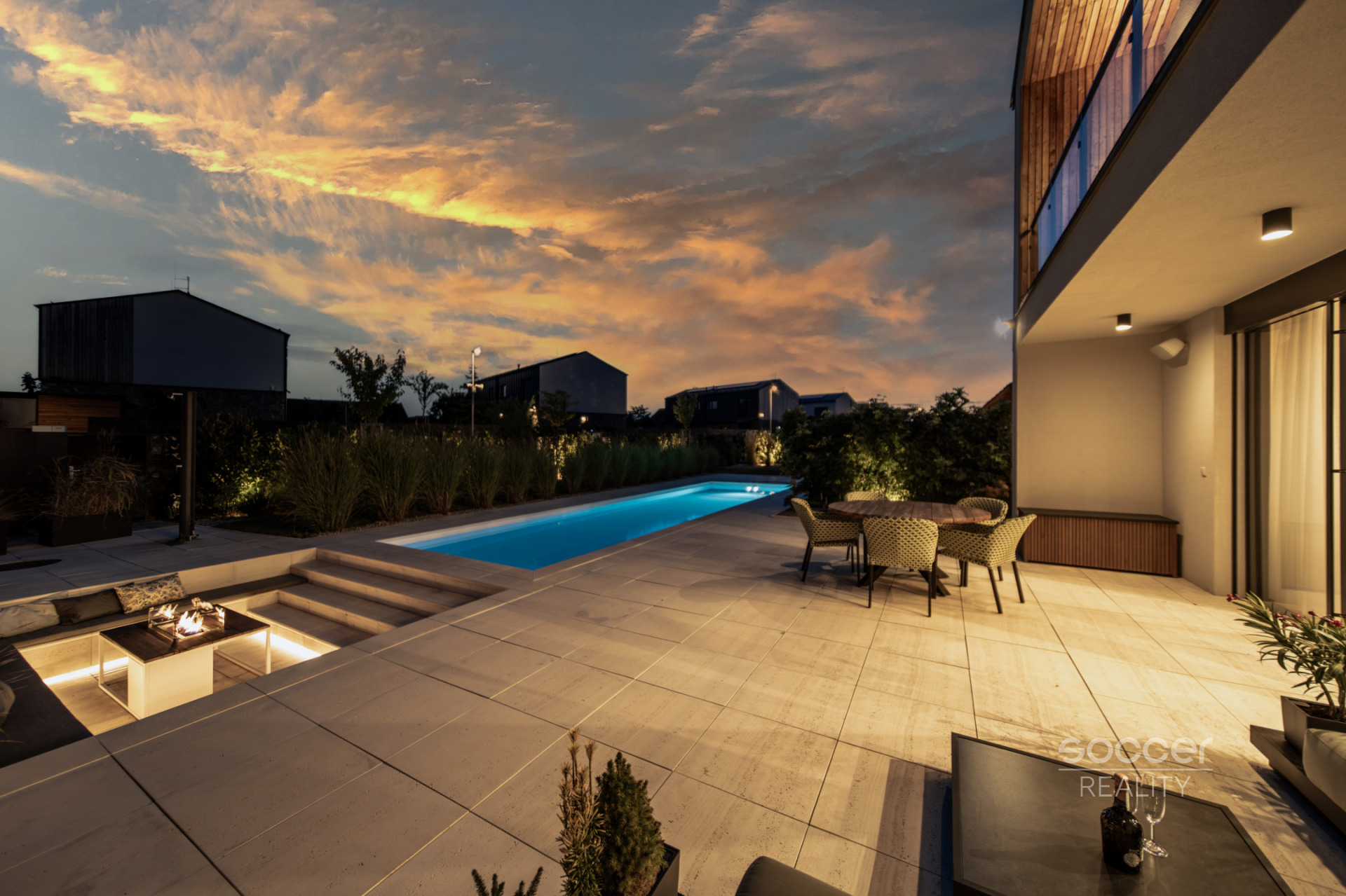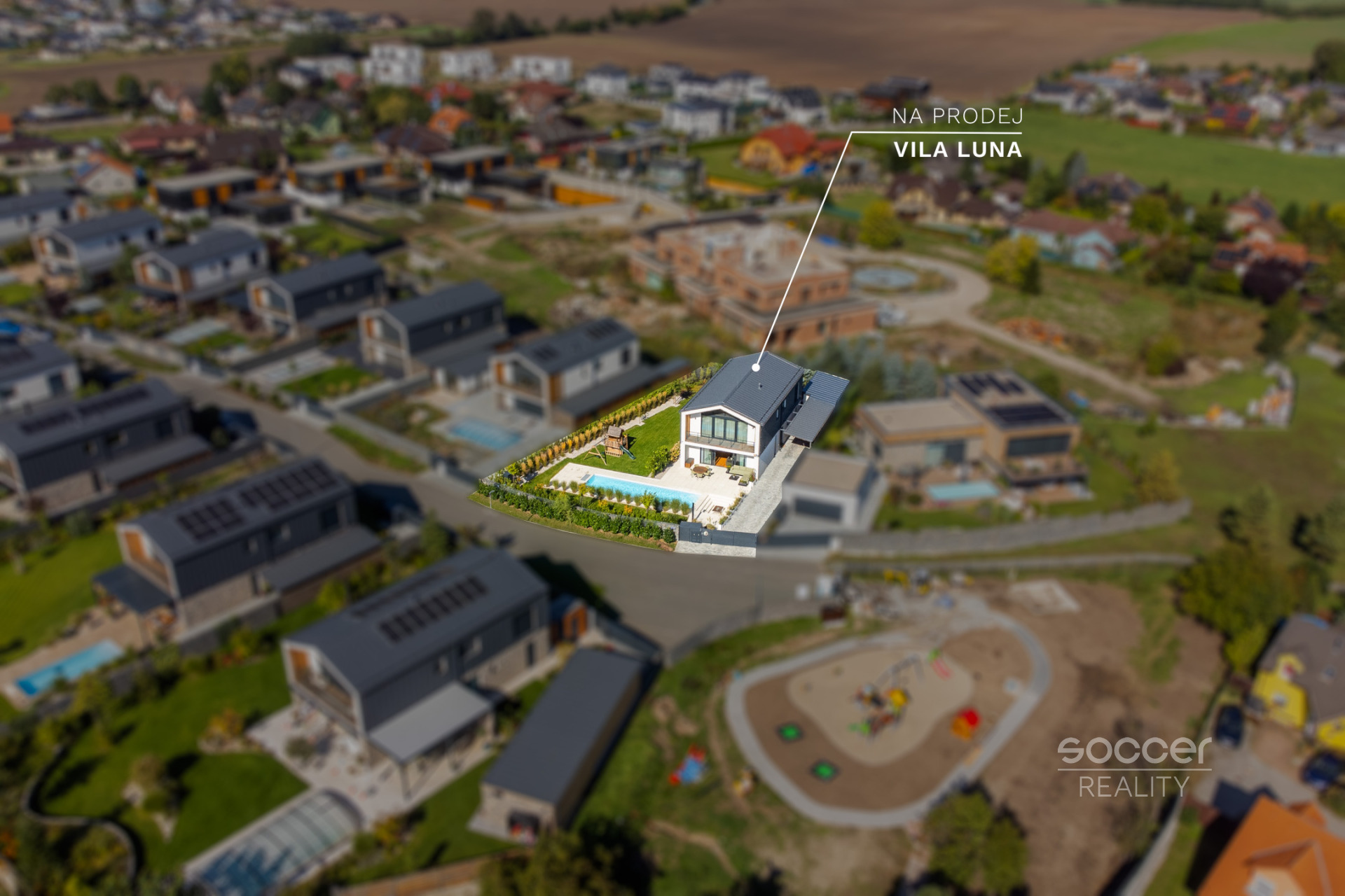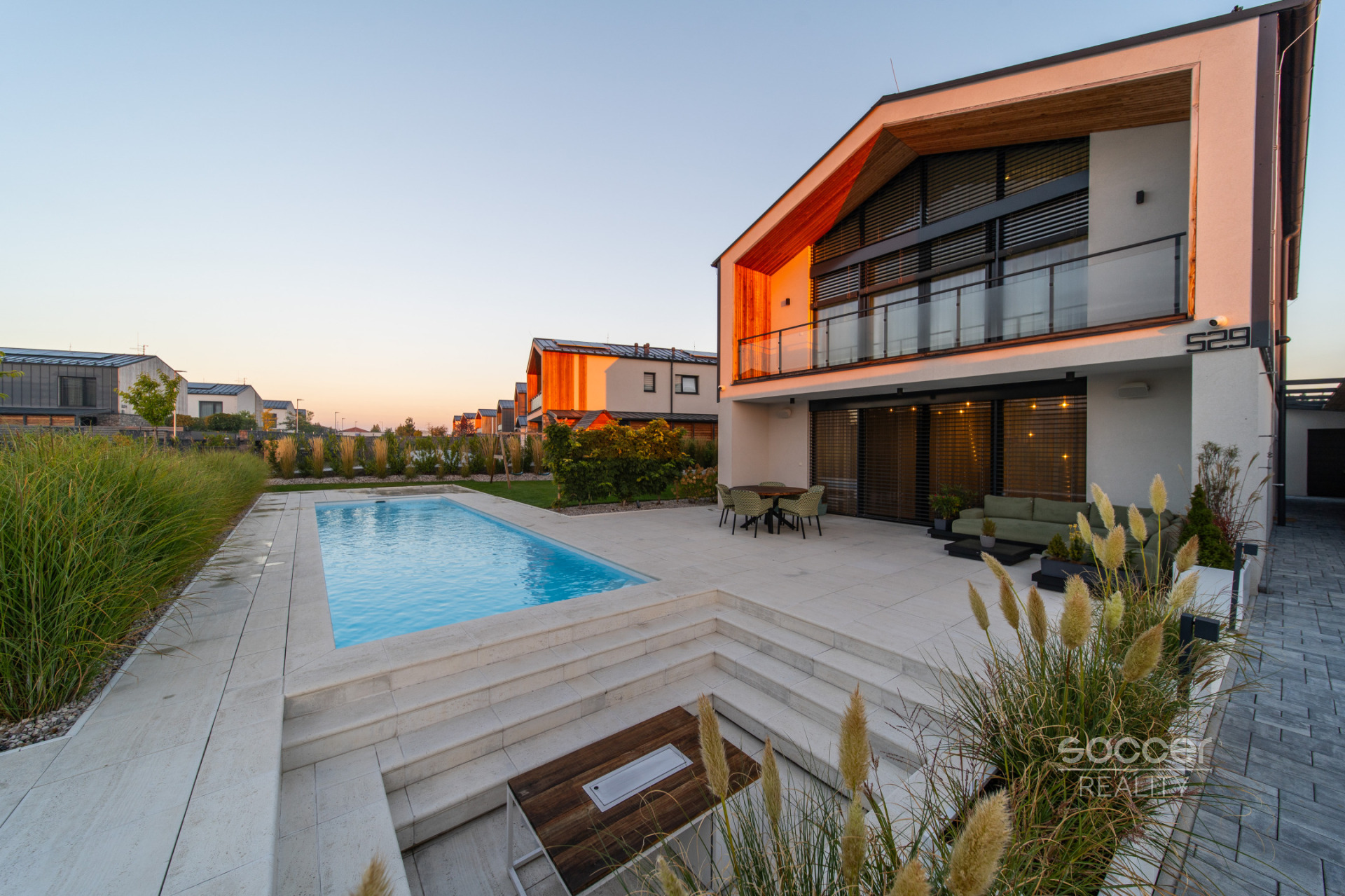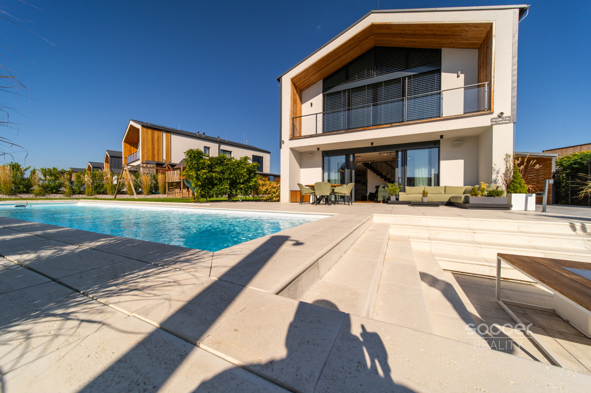 Tato moderní a energeticky úsporná stavba (energetická třída B) byla postavena z prvotřídních materiálů a nabízí velkorysou dispozici 6+kk. V přízemí je prostorná předsíň s vestavěnými skříněmi, koupelna s WC, technická místnost a pokoj. Dominantou domu je jižně orientovaný obytný prostor spojující obývací pokoj, jídelnu a kuchyň. Z obývací části je vstup na terasu s výhledem na 12m bazén se slanou vodou, obklopený bílou dlažbou, která prostoru dodává jedinečný charakter. Večery na terase zpříjemní osvětlená zahrada, moderní venkovní krb a špičkový audio systém Bowers & Wilkins.