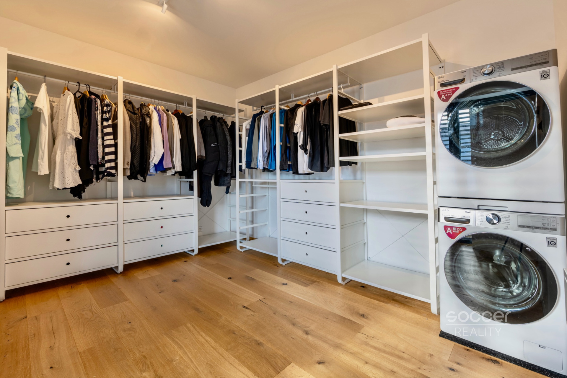 Interiér domu je promyšlen do posledního detailu jak po praktické, tak i designové stránce. Architekti zvolili kombinaci masivního dřeva, světlých stěn a kontrastních černých prvků, které vytvářejí elegantní a nadčasovou atmosféru.