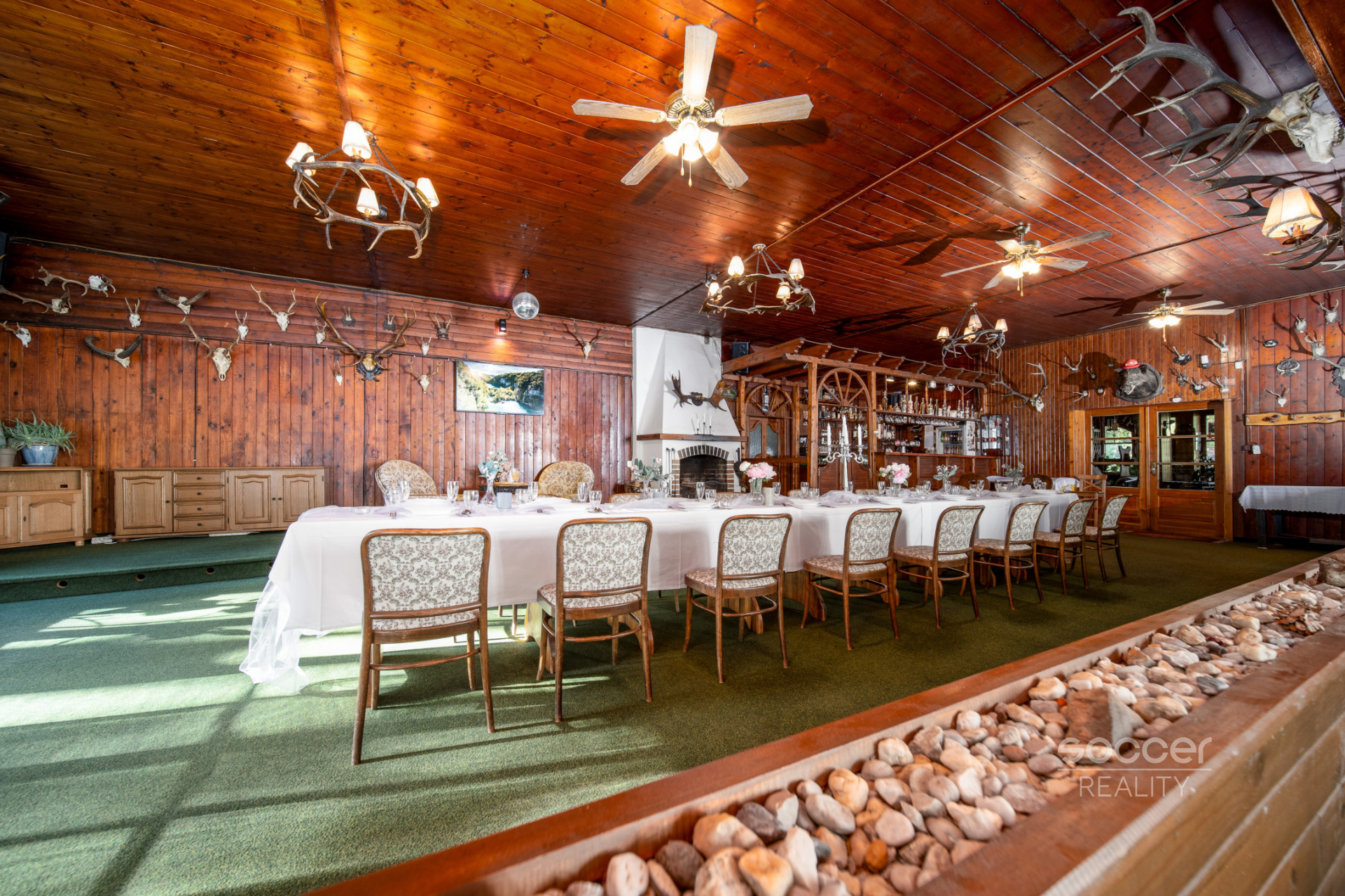 Nabídka zahrnuje možnost převzetí kompletního zařízení v dobovém loveckém stylu – masivní borovicový nábytek, lovecké trofeje, stylové lustry, bar, komody a kompletně vybavenou restauraci s kuchyní a letní terasou.