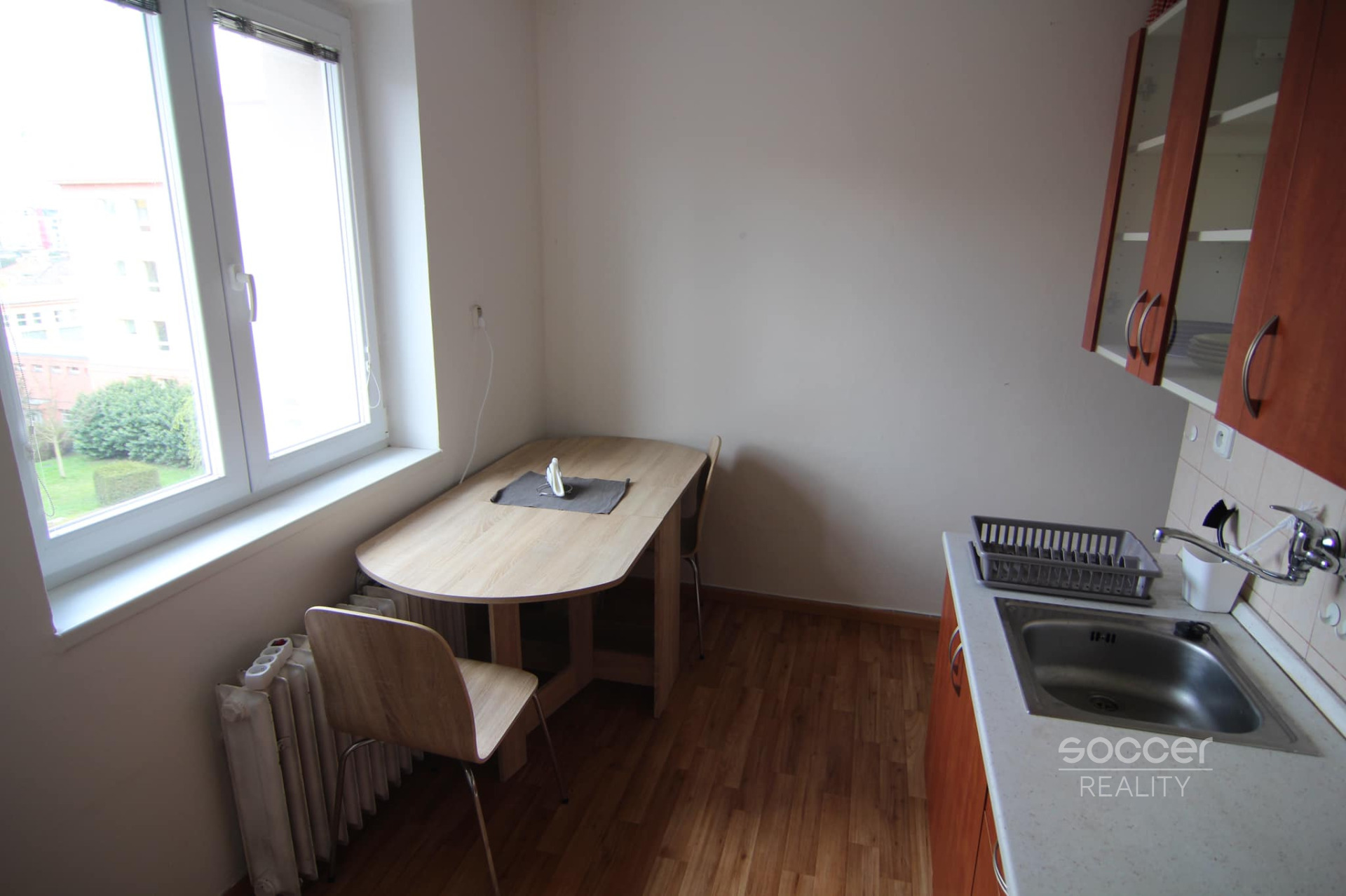 Byt má samostatnou kuchyni s oknem východní orientace vybavenou jídelním stolem se židlemi. Součástí kuchyňské linky je elektrická trouba, plynový sporák a dostatek úložných prostor.